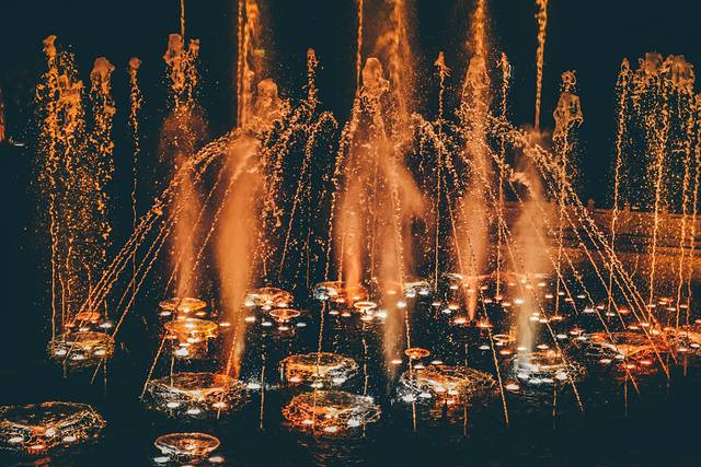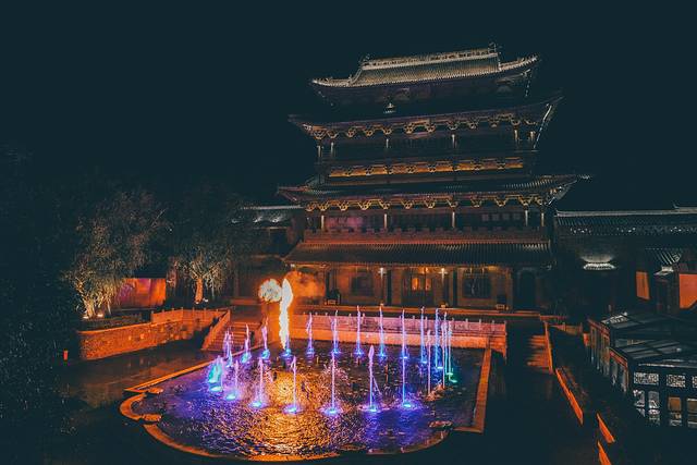除了望京楼上变幻莫测的灯光秀,楼前的音乐喷泉也不甘示弱,水柱随着音乐灯光不停的摆动,不时还冒出耀眼的火光,音乐与灯光的完美融合,水与火的激情碰撞,都说“水火不相容”,在星光璀璨的夜空下,应和着悠扬的乐曲,背靠着俊美的长城,科技将对立的美融合在一起,感受水的温柔、火的热情、光的魔法。