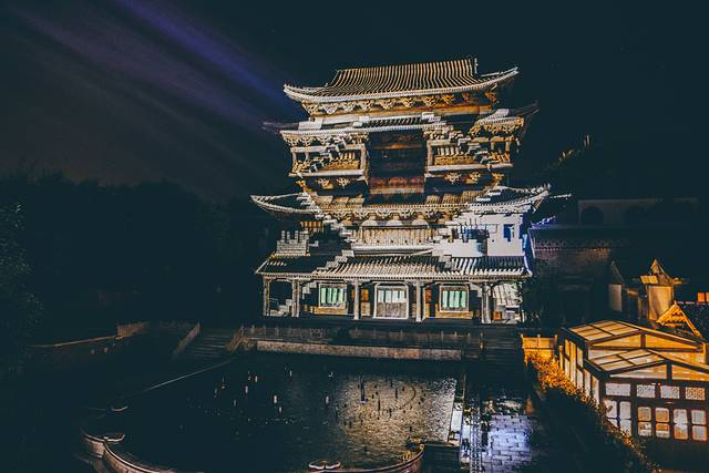 古北水镇 晚上最热闹的地方要属望京街了,这里将会表演一场精彩绝伦的灯光水舞秀。晚餐过后大部分的人都会聚集到这里,有的人甚至都会提前半个小时就在这里等候,也许是怕找不到一个好的位置来欣赏这场视觉盛宴。望京楼也会早早的亮起灯光,为人们指明方向,悦耳的音乐也随之响起,似乎是在欢迎人们的到来,为马上要开始的表演预热。