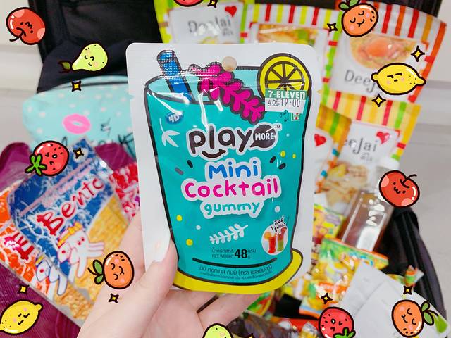 这款Playmore的糖果在7-11仅卖20铢一包。一开始我买这个,纯粹是因为看包装可爱,花纹是可爱的卡通风格。里面软糖的颜色是鸡尾酒的色系,新奇又好吃。