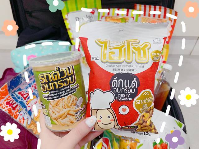 在BigC、Ratchadamri等地方都有的购买,单卖25铢/包,套装160铢/每套。这个品牌几乎包含了所有可以吃的好吃的烤昆虫,不管是烤蚕蛹还是烤蠕虫,都应有尽有。我其实以前从来没吃过,但这次却是被包装的可爱征服了,上面还有小虫的卡通图案,忍不住就下手试试啦~