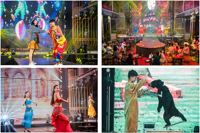 当然,提醒大家唷。这个演绎吧不止这样嗨力十足、五光十色的一面,剧场的白天演出是跟夜晚演绎吧不一样的风格。演出方面十分诙谐有趣,演出比较多元化。开始便是美女们的热场舞蹈秀,配合舞动的灯光和激昂的音乐,不禁让观众欢呼起来!热场过后又换了一种风格,出来的居然是“熊二”!不错,确实是真的熊!萌萌的小熊还会表演吊环,那笨笨的身姿太逗了,引来不少观众的笑声。不过熊二虽然体型不小,但每一项表演都完美完成,太厉害了!接下来还有精彩的魔术表演和美妙的歌声演出,这么多精彩的表演怎么能错过呢?来梦幻奥陶纪记得来“风情演绎剧场”捧场哦!让玩累了的你们到此一边观赏表演一边稍作休息,一个不错的选择。