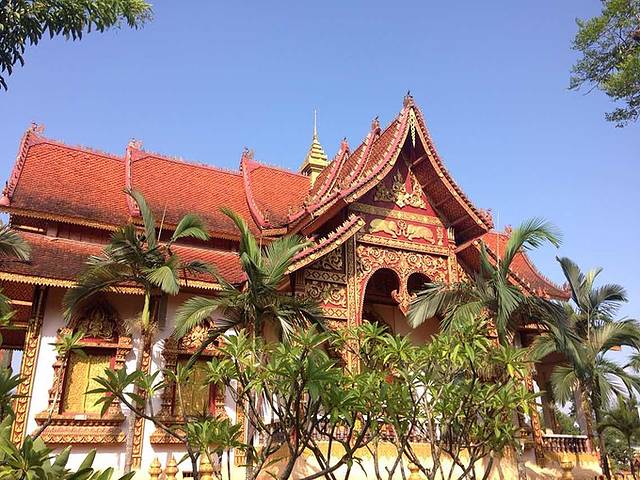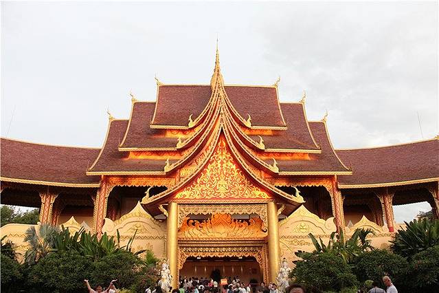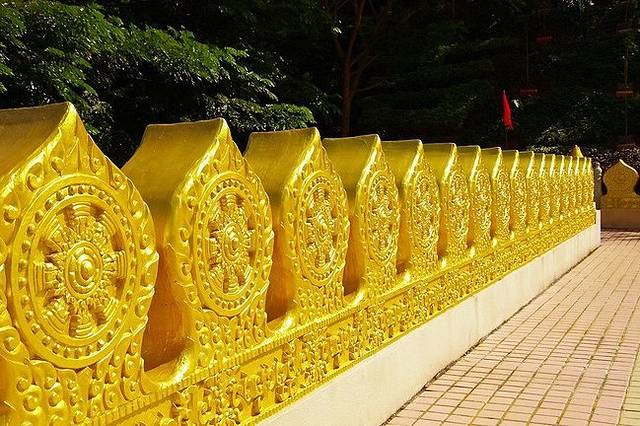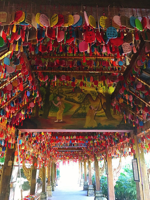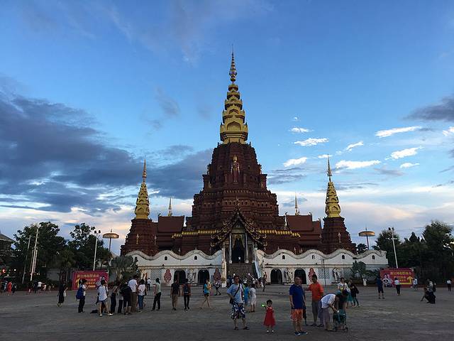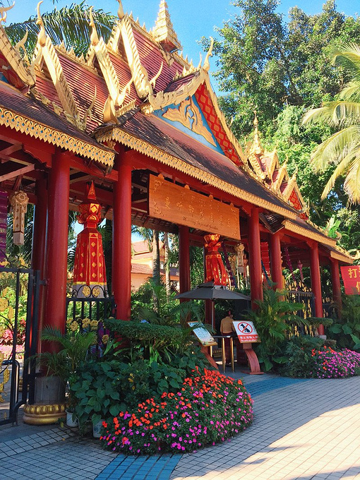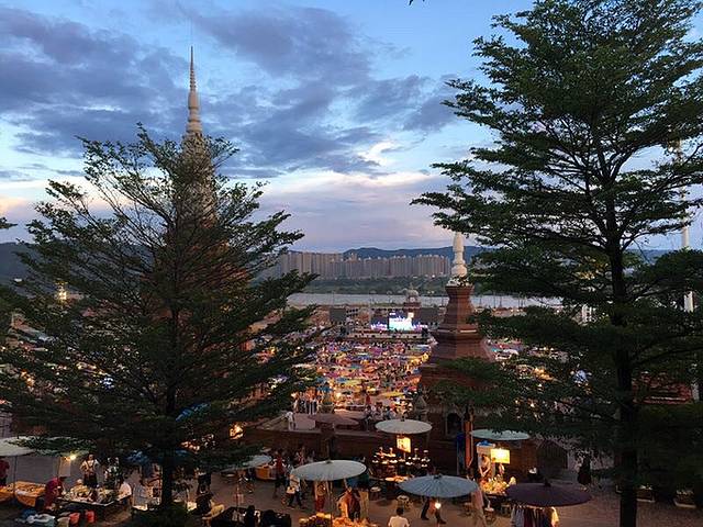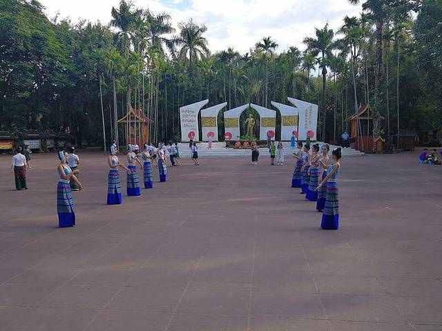 勐泐大佛寺位于勐泐大道的尽头处,如果体力好可以直接爬上山顶,对于体力稍微差一些的推荐乘坐观光车登顶,虽然坐车的时间不长路途也不太远,但是免去了3000多级台阶的痛苦,我们是从山顶往下游览的,山顶的金佛威严巨大,从山顶还能看到勐泐大道像中轴线一样笔直和看到整个景洪市区,大佛寺每天都有泼水节表演,也是叫浴佛仪式,在旁边还有孔雀放飞的活动,很适合带小孩的家庭前往游玩。再往下走,金碧辉煌的庙宇同样气势恢宏,充满了泰国风情