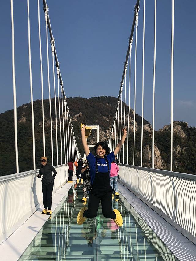 凤凰山有华山的险,有黄山的美,早上八点半抵达。早上天气微凉,雾气环绕。一定要买手套,2元一副。我一直穿着半袖长裤,爬山是没有问题的,不会觉得冷。伙伴们相互鼓励着一直爬到了山顶,踏上了网红打卡地点——玻璃索桥。特别美,特别值得一去!