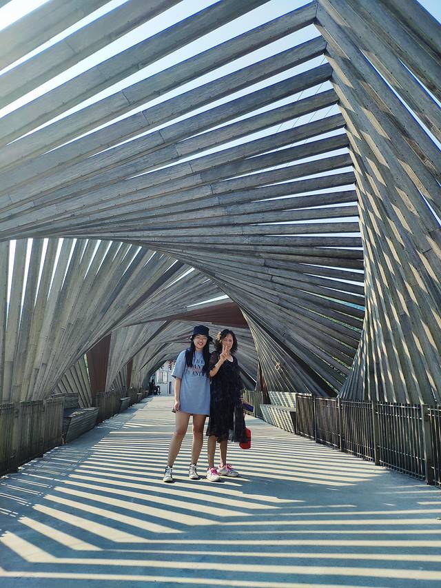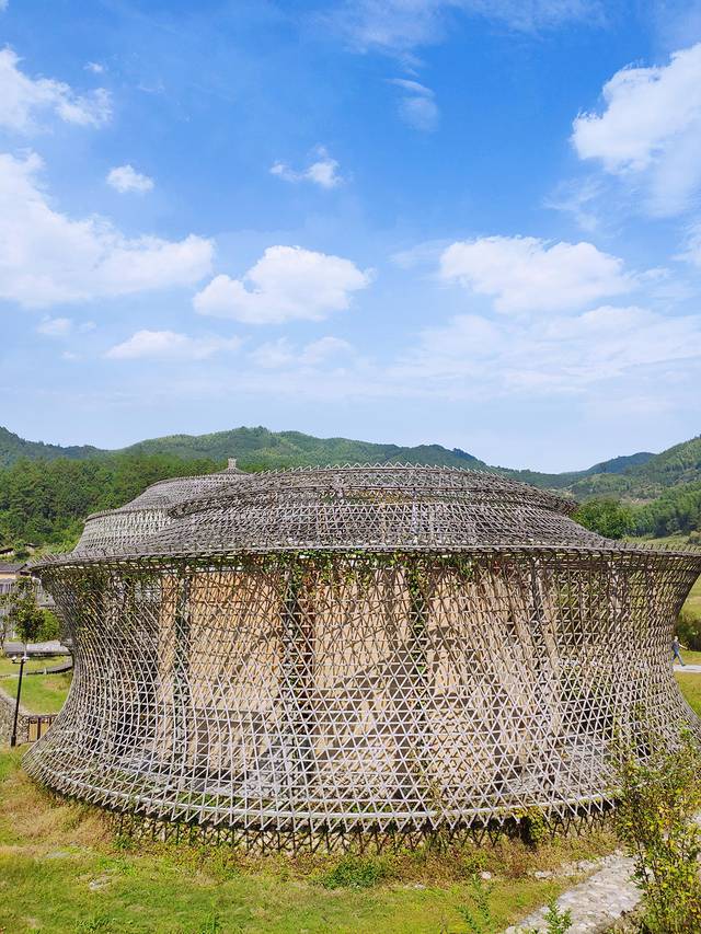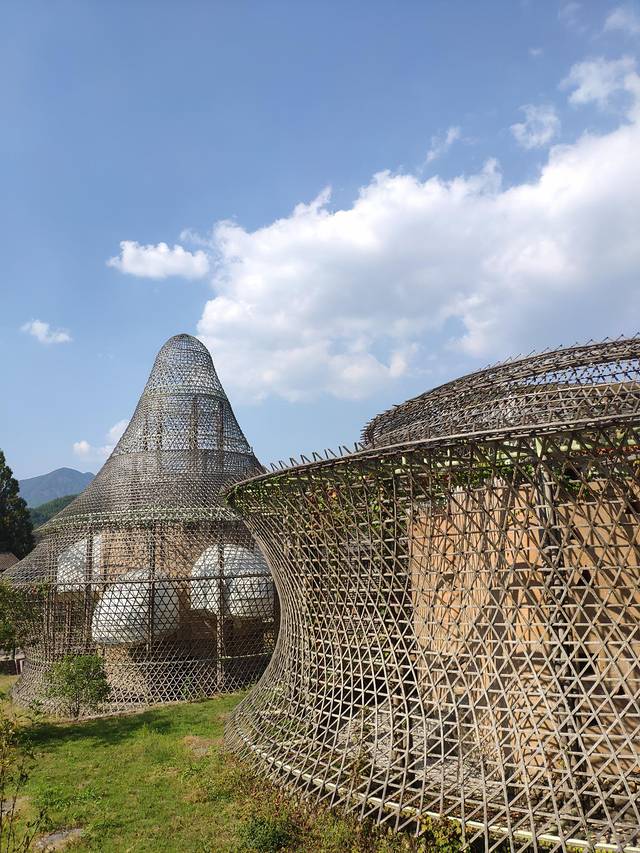 这座双螺旋竹桥,一头连接李家大院古老村落,一头牵起现代感竹建筑文创生活园区