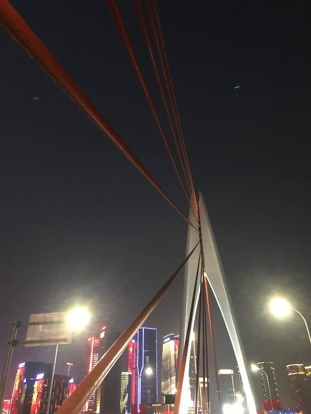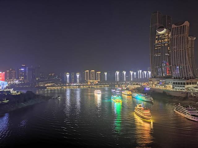 跟着人群一直往前走,黑压压的都是人头,最后才发现我们到了千厮门大桥上面,本来是想去洪崖洞对面的马路上的结果人太多了走到了桥上,还好这个桥双向都已经封路了,只允许行人观赏风景,桥上人少多了,站在桥上确实风景很好,不远处的来福士,重庆大剧院,侧边的洪崖洞,隔壁的不知名的大桥,灯光都亮起来了,江面的游轮,真的像是一个不夜城。