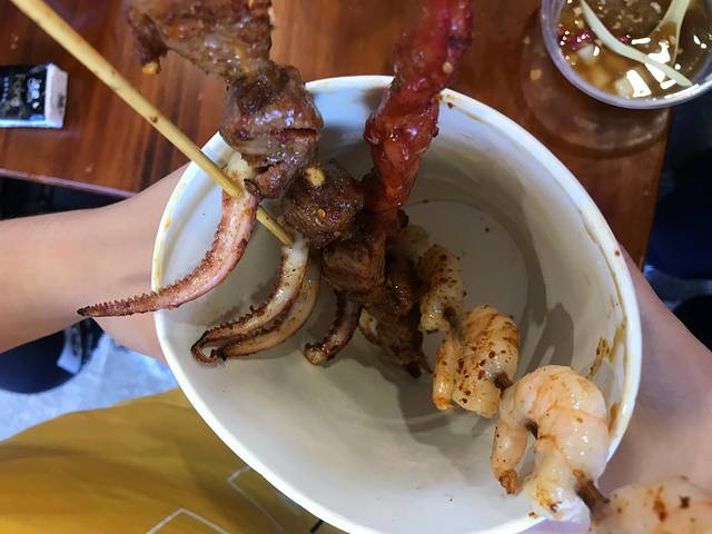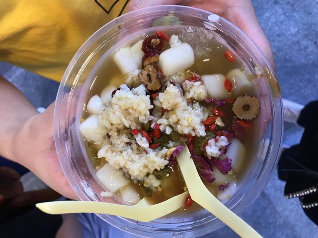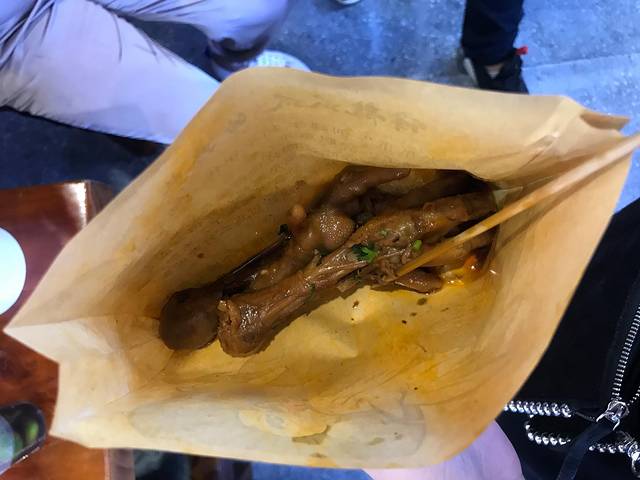 吃完火锅后大概三点左右,想着里轻轨观音桥不远,选择坐轻轨到解放碑那边,实时证明重庆的路真的很难走,上上下下,还过地下通道,说的是一公里左右,愣是走了二十多分钟,而且发现观音桥这边很繁华,路过观音桥公园的时候,公园里都是人,老爷爷老奶奶三五成群的再打纸牌,小孩子成群,还有广场舞的,我没见到北京那个公园能有那么热闹的,旁边就是有种商业街 百货店,还是很繁华的,下去买轻轨地铁卡的时候人都排了好多,到处都是人(要是华为手机的话直接可以添加他们那边的轻轨和公交卡),而且还发生了一件尴尬的事情,坐轻轨的时候不知道他们这轻轨竟然还有长短车型之分,我们当时在车尾等车,发现车直直的开在前面去了,所以坐车的时候尽量往中间去。我们到较场口下的车,发现八一好吃街在第九出口,之后就是各种在里面绕,出口太多,一旦走错就会绕远好多路,所以最好提前查好,走到地面,我们都感觉累了,正好出来的地方有人在唱歌,就坐在对面的阶梯上买点饮料听了一会,之后导航去八一好吃街,到了之后发现人真的好多,不过还没有晚上的人多,去买了传说中的各种小吃,好又来酸辣粉(排队排得老长了)乐山钵钵鸡(超级辣),降龙爪爪(鸡爪),金榜题名(猪蹄,建议买蒜香的,麻辣的太辣了),还有旁边一家烤串店,墙裂推荐里面的烤虾(不辣很好吃),一只酸奶牛(很解辣的饮品),冰粉(反正辣的不能行的时候来一杯就对了).