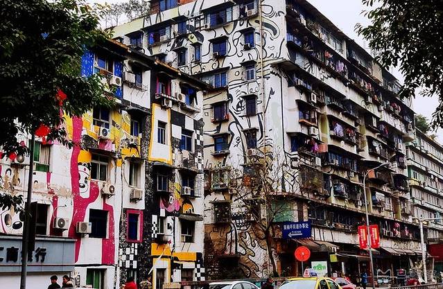吃完之后胃里面各种辣,只能靠冰粉与饮料缓解。美食吃完后就开始往洪崖洞方向去,此时已经接近傍晚,两边的路灯都开始亮起来,随着人群缓慢移动,路上经过国泰艺术中心,该建筑由国泰大戏院和重庆美术馆组成,俗称“筷子楼”。可以说,国泰中心的独特造型在全国也是十分罕见的。