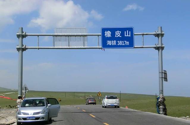 也就十几分钟的时间,雨小了一些,我们上车开了几百米,路旁有一小片可以停车的空地,有一辆车停在那里,当时没在意,主要是刚刚休息过,不想随即模模糊糊得看到了橡皮山,海拔3817m的路牌(下图是后来网上下的),更没有想到的是过了此牌,山路一下变得陡峭,感觉有45度角,急弯连连,阴雨中对面来车一辆接着一辆,因为是上陡坡,轰着油门,速度稍快的会超过中心线,心提到嗓子眼,手忙脚乱的拍了一些照片和视频,下山后发现完全没有拍出效果。连续下了不少的陡坡,雨也越来越小,在黑马河乡休息了一下,主要是拍拍照,感觉黑马河乡的住宿条件要比茶卡镇差不少,心中有点小庆幸。