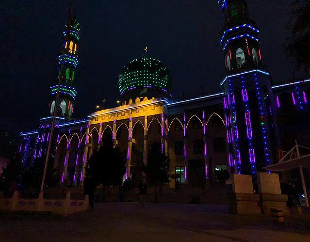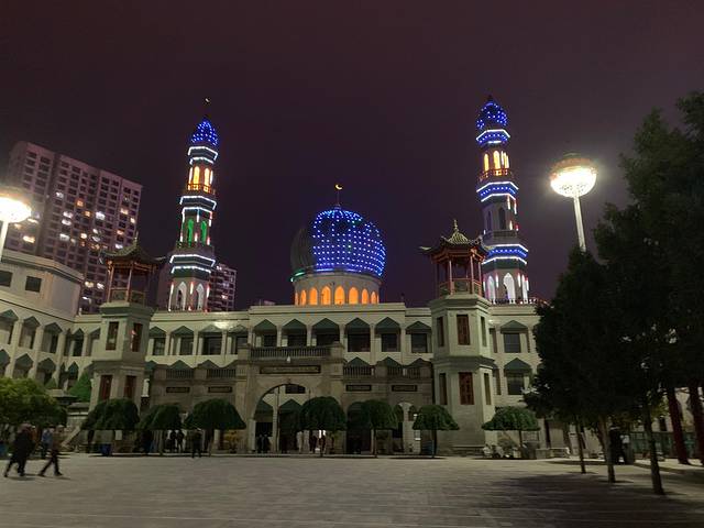 夜幕降临,清真寺的外面亮起灯光,整个清真寺美丽奇幻