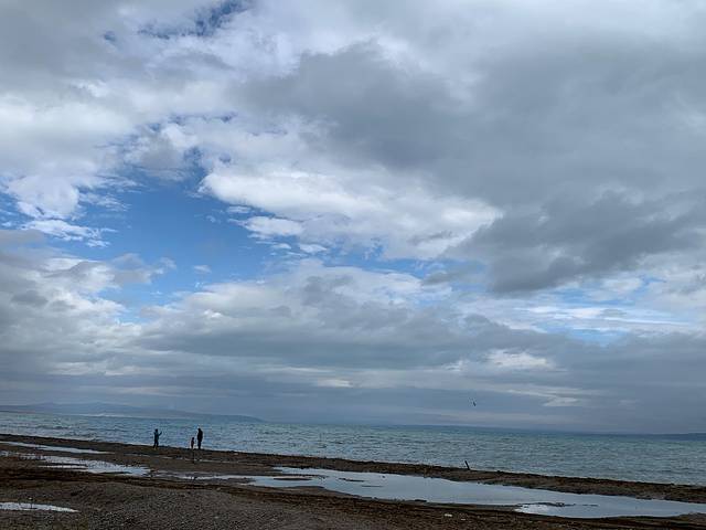 青海湖又名“措温布”,即藏语“青色的海”之意,中国最大的内陆湖泊,也是中国最大的咸水湖。由祁连山的大通山、日月山与青海南山之间的断层陷落形成。因为是阴天,湖面阴沉沉的,风大,很冷,套上了鸭绒袄,下车赏景拍照,虽然没有湛蓝的天空和青色的海面,汹涌的波浪是另一种景致。