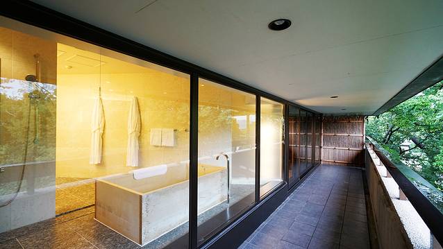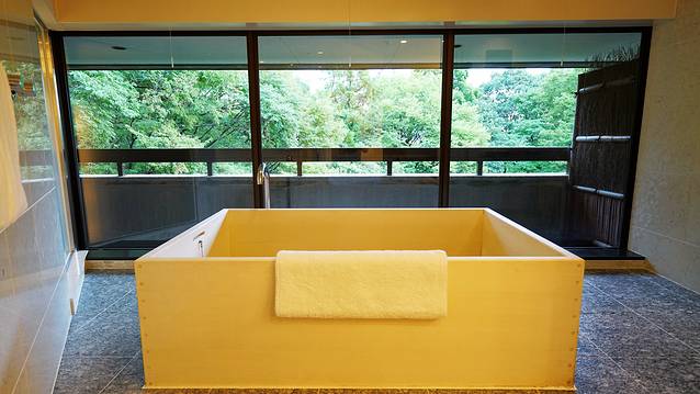 当你走进浴室,更是会让你眼前一亮。采用木制结构的汤盆,大到足以供3个成年人同时泡汤,而浴室看出去的风景郁郁葱葱,等到再过一个多月,红叶泛红时,风景更是可以称为绝景。