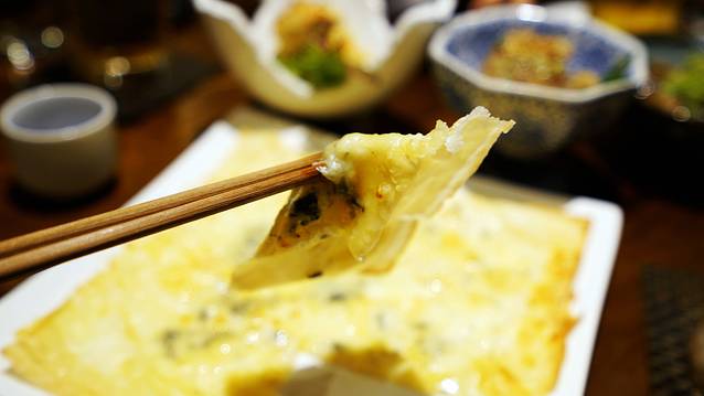 益や酒店的地址就在祗园四条站,Google map搜居酒屋的名字,顺着导航可以轻松找到。不过,我去这家居酒屋,不是为了喝酒,因为我不太喜欢日本清酒的口感。在这里,我吃到了一个很神奇的东西,豆皮披萨。(见下图)