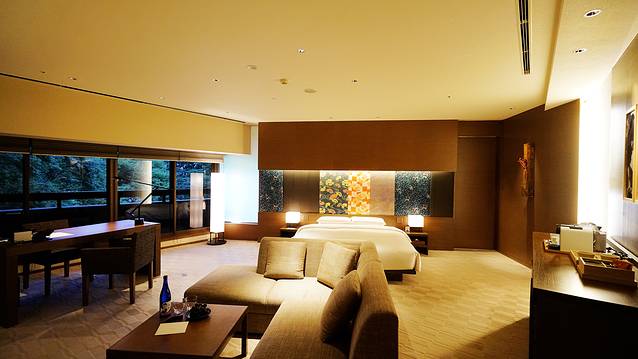 酒店的整个建筑色调,和周围的环境相辅相成,门口的竹林给其又增添了一些雅致。走进酒店,热情周到的服务,让人有一种如沐春风的感觉。走进京都凯悦的房间,让我会有一种走错房间的感觉。因为,日本传统的酒店客房,面积都很小,有的小到连转身都有点困难。而京都凯悦的客房大到可以让你旋转跳跃转圈圈……
