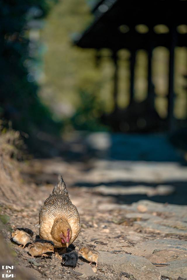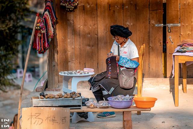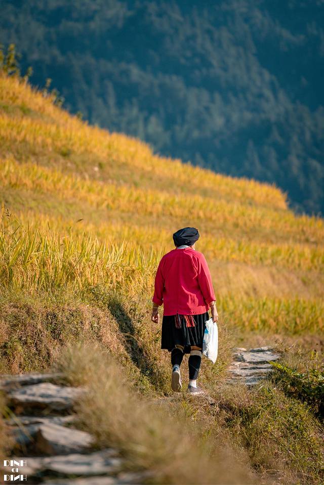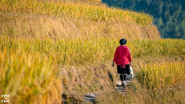 时不时能看到苗家人路过,桃红的上衣就是她们的标志,长发裹在黑色的盘头里,在黄色的田野间很是显眼。