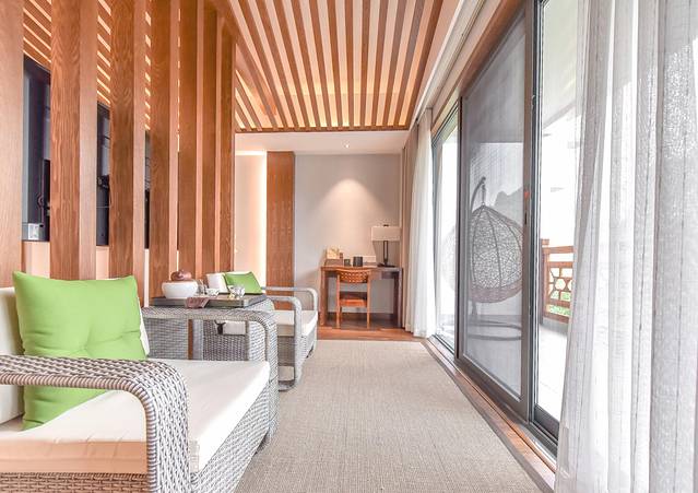 内部陈设:客房各类摆设细致整洁,甚是贴心。色彩搭配得当,眼睛的疲惫之感顿减,设有网红浴缸,马桶,浴巾及毛巾架都保持着暖暖的感觉,床和枕头软硬适中,被如丝绸,分分钟能美梦一觉。阳台还设有特色小吊椅,傍晚坐在上面赏赏余晖也是无比的惬意。