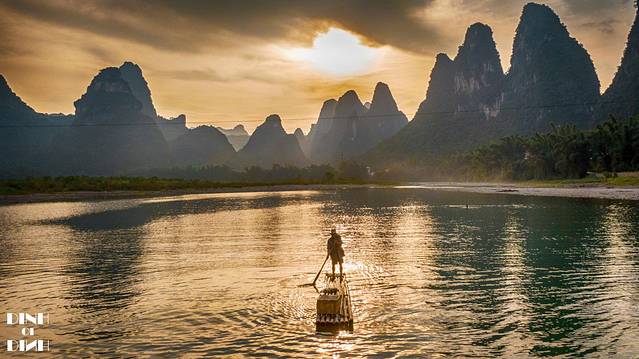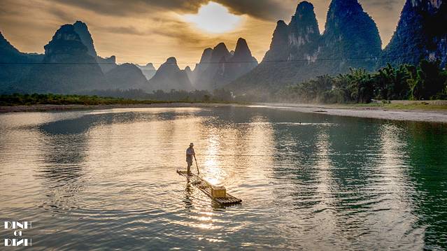 最爱 漓江 的日出和日落,总觉得比白日看到清奇的山水多了几分温柔。淡淡的余晖洒落在江面,水儿随着船儿的的移动荡着,波光粼粼,感觉分外安详,船夫娴熟地摇着自己的竹筏归家,此情此景是否有人来首渔舟唱晚?