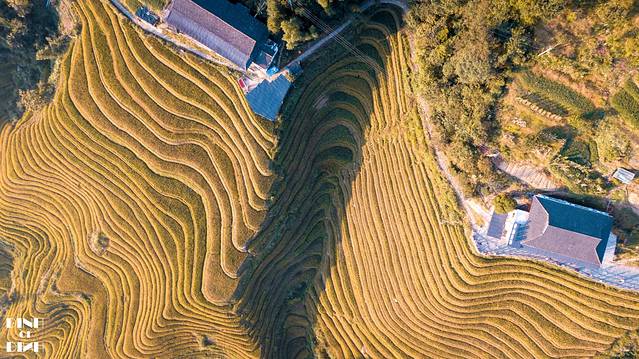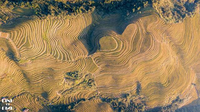 大寨的千层梯田是最精华的景点。如果说一号景点是因为日出最出名的,那么千层梯田不需要日出日落也能让人流连忘返。这里的梯田最为壮观,波澜起伏的山势上,梯田层层叠叠的匐在山坡上。十几户人家的小村庄点缀在梯田间,画意渐浓。