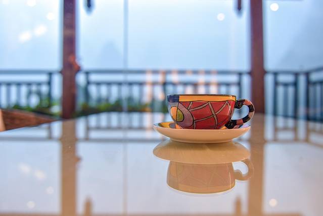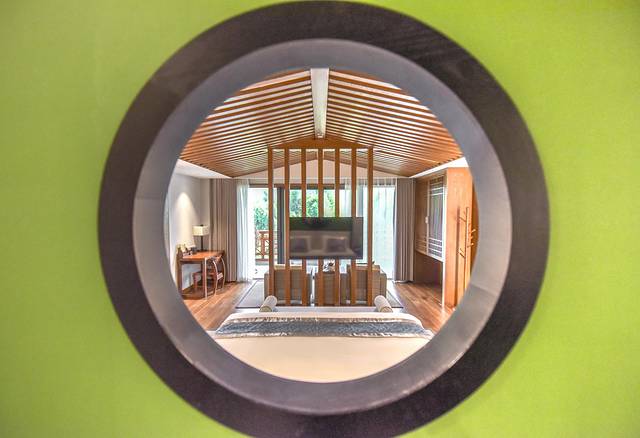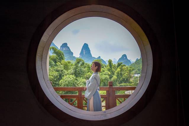 带上的汉服居然在酒店穿上了,因为酒店的设计实在 太特 色了,和老板周姐聊过之后,周姐带着我们参观了酒店,发现了一个网红角度,穿上汉服趁着下一波客人还没入住,和前台提了小请求,来房间拍了一张风光照。