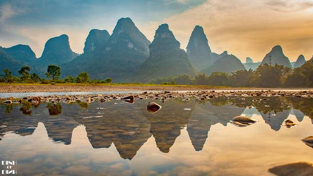办好入住,小小睡了个午觉后,傍晚先去了酒店前的 漓江 江畔,太阳已经向着西边渐渐落下,江畔浅滩边上的的螺蛳山在落日下倒映出清晰的模样。