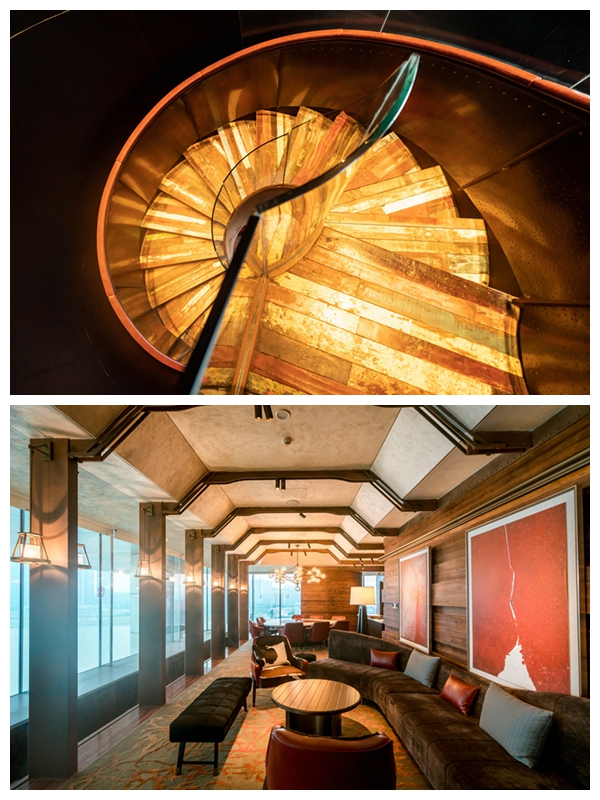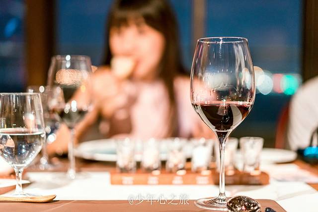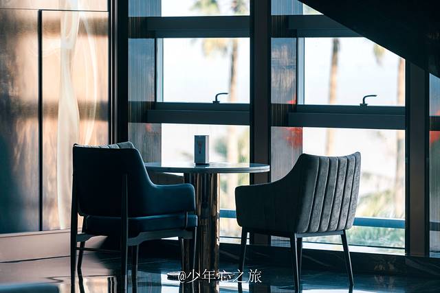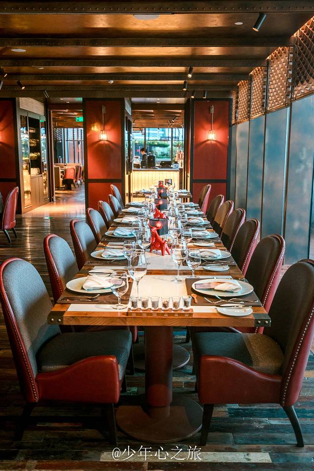 顺着旋转楼梯上去,是二楼的包厢,尽享270度海景景观,复古牛仔风味十足,参观完后我们移步一楼,整齐的餐具乘两列一字排开,红色皮具桌椅和背景配上暖黄的灯光,给人以强烈的视觉冲击,配上窗外阑珊的海景夜色,又多了几分浪漫之情。