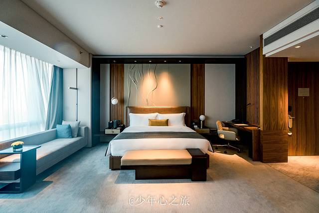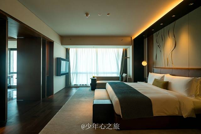 我住的客房是酒店的行政海景房,位于43层,打开窗帘就可以看到大海,超大的落地窗设计,让房间更为宽敞明亮,简约而不简单的现代化设计,典雅而温馨。房间似乎有感应系统,每次打开房门,窗帘都会自动拉开,床品也非常的舒适,根据人体工程学设计,配备多种软硬枕头和抱枕,阅读模式、夜景模式一键即可控制所有的灯光,还有时尚的蓝牙音响时钟,细节做得非常到位。