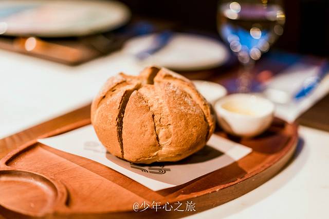餐前自制面包,配上松露黄油或烟熏茄子酱,外脆内酥。接着是大明虾和三文鱼沙拉,配上蒜泥蛋黄酱,柠檬、西柚和红酢浆草,摆盘优雅,小巧精致,鲜甜细腻,美味直抵人心。