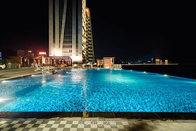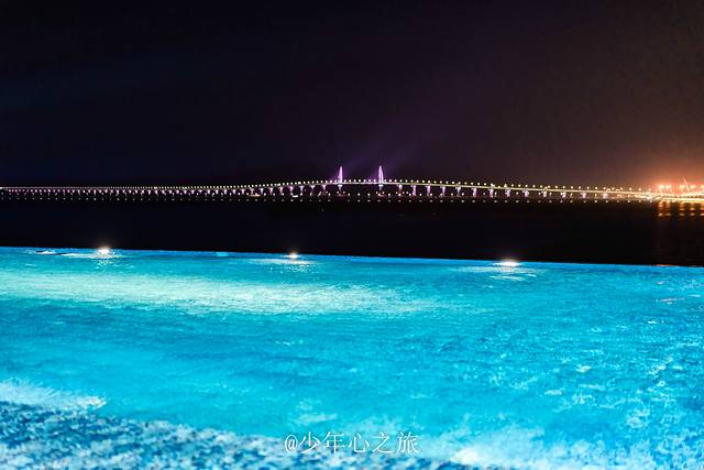 而夜晚的天际泳池,又散发出另一种迷人的风采,tiffany蓝般的纯净,如同一块蓝翡翠一般,而远处的港珠澳大桥,也时不时更换自身迷人的色彩,点亮黑夜,给人以光的希望,无边际泳池和港珠澳大桥两者相得益彰,构建出珠海最美的夜色。