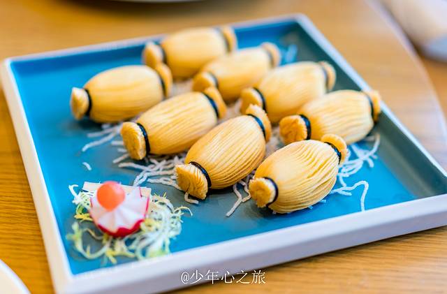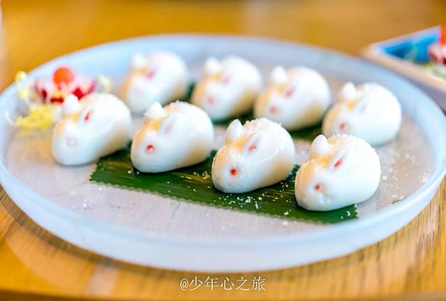 同样引人注目的还有鲍鱼烧麦,烧麦上配鲍鱼,一样是刷新了本人对烧麦的认识,简直太奢侈了,但两者的配合在味道融合方面确实毫无违和感,反而有些回味无穷。白兔椰子糕,让人不忍下口的一道甜点,听说用勺子拍打兔子它的屁股会震动。