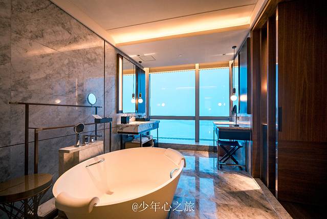 浴室也非常宽敞,和房间一样,能看到180度的海景,白色的大理石看着让人心情明快,双洗漱台避免了早上匆忙洗漱位置不够用的尴尬,入夜窗外的蓝调和室外暖黄的灯光形成了冷暖对比,没有什么比夜深人静的时候边泡澡边欣赏窗外美丽的夜景更让人惬意了。