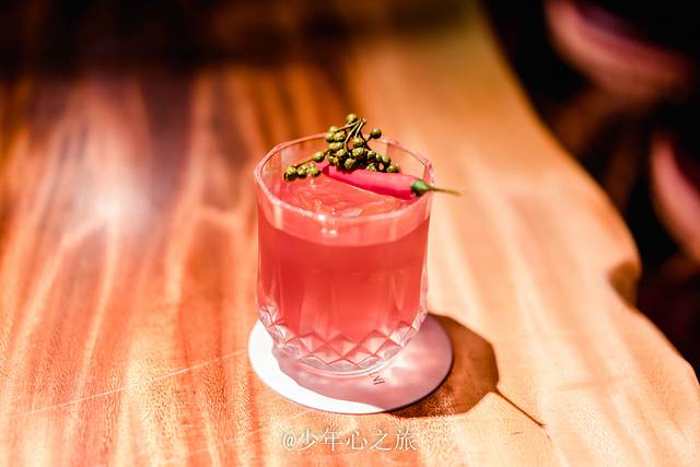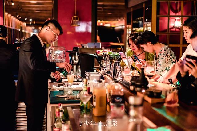 餐厅的隔壁还有一个酒吧,两者是相通一起的,但因为酒吧10月份才开业,所以我们幸运地成为了这个酒吧的第一批顾客,富有金属和复古元素的装修风格和餐厅一脉相承,琳琅满目的酒看得我们眼花缭乱,但帅气的调酒师似乎在其中游刃有余,几句对话,就能听懂你想要什么,不一会的功夫,一杯精致可口的鸡尾酒就呈现在你面前。