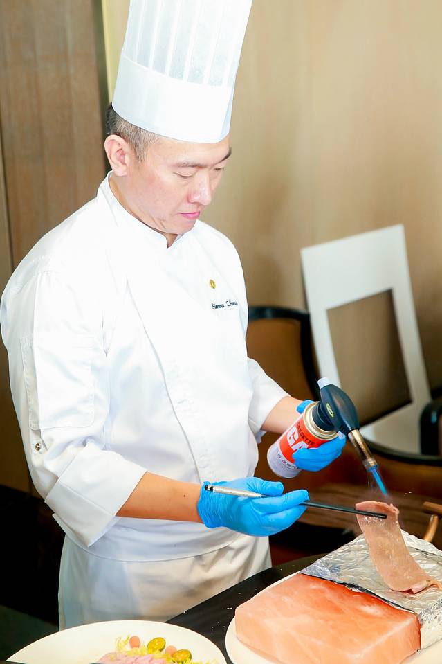 这次茶点的重头戏,无疑是这道火焰雪花牛肉了,中餐行政总厨周小丰师傅亲自操刀上阵,现场表演火烧牛肉,而所有的操作,都在这块喜马拉雅山岩盐上完成,有助于牛肉和岩盐的咸味相融合,再配上一小块“东坡肉”和水果,精致十足,鲜嫩的牛肉让人赞不绝口。