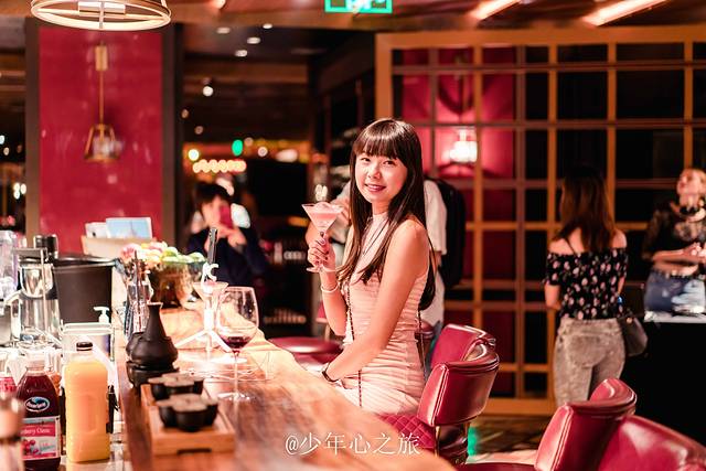 不知为何,特别喜欢这里红色浓烈的背景色彩,以至于拍出来的人像有种异域风情,更有几分欧美复古的感觉,在如此别致的环境下小酌几杯或吃点甜点,也是别有一番风情韵味。