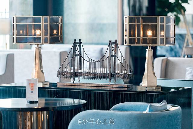 二楼大堂的旁边,就是桥吧,为什么叫做桥吧?因为站在这里的窗前,就可以正面观赏到世纪工程港珠澳大桥,所以取名桥吧,从大堂的很多摆设品也可以看出这一点来。