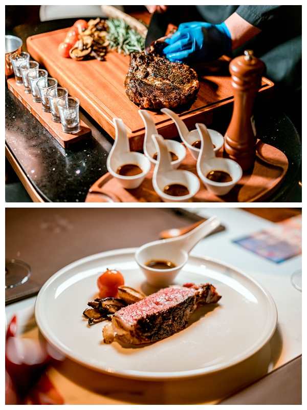 而后的操作更让我们惊讶不已,连切牛扒的刀具都是静心制作的,来自英国、美国、法国、日本的6把刀具各具特色,我们根据自己的喜好挑了一把,同时吃牛排搭配的海盐也有6种之多:原味海盐、松露海盐、柠檬海盐、番椒盐、胡蒜盐以及黑川盐,可以根据自己的口味来搭配,从其他环节精心的程度可见牛排的品质有多高。第一次吃到如此有仪式感的牛排,也刷新了我们对牛排的新认知。