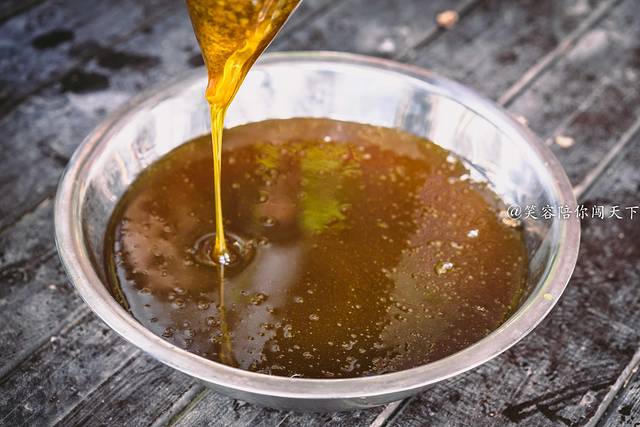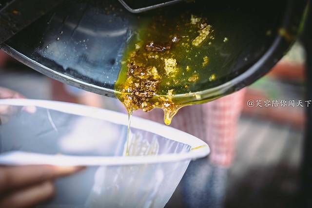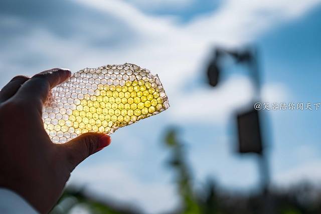 我们看师傅取蜂蜜的时候就是一层一层的看看蜜是否够多,够多的取出来用刷子把蜂蜜刷走,太少的就放回蜂箱。大人们还可以自己把单层蜂箱拿到下面准备进行取蜜。师傅先用刀把最上面的一层划开,就可以看到晶莹剔透的胶状蜂蜜。看到如此蜂蜜口水都要耷拉下来,小朋友都忍不住用手去触摸蜂巢,舔舔手里沾到的蜂蜜。别慌,师傅会把部分蜂巢切割成小块让大伙尝尝蜂巢蜜,果然,甜而不腻。在橙色的蜂蜜中还透着一丝绿色,园长介绍说,这就是纯正的五倍子蜂蜜,和其他蜂蜜的颜色不太一样,会有点偏绿色,味道上入口先会有一丝苦涩,随之而来的是厚重的甜味,但也不会让你觉得腻。