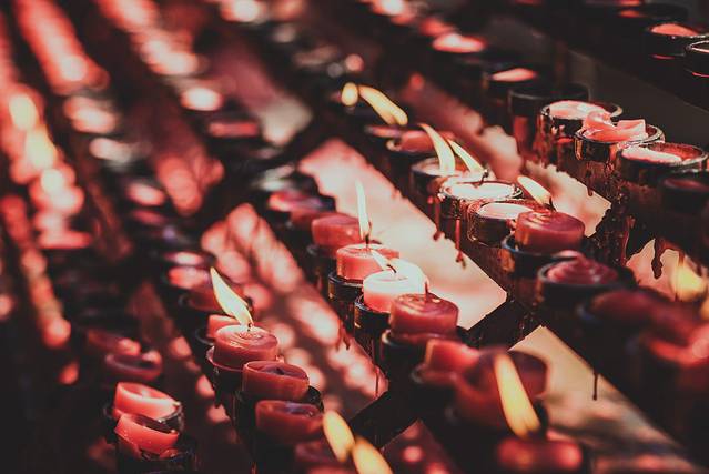 教堂门前的祈祷区内,一排排烛火随风飘动,是人们对于平安美好的向往。虔诚的信徒们做着礼拜,静静地祷告着。