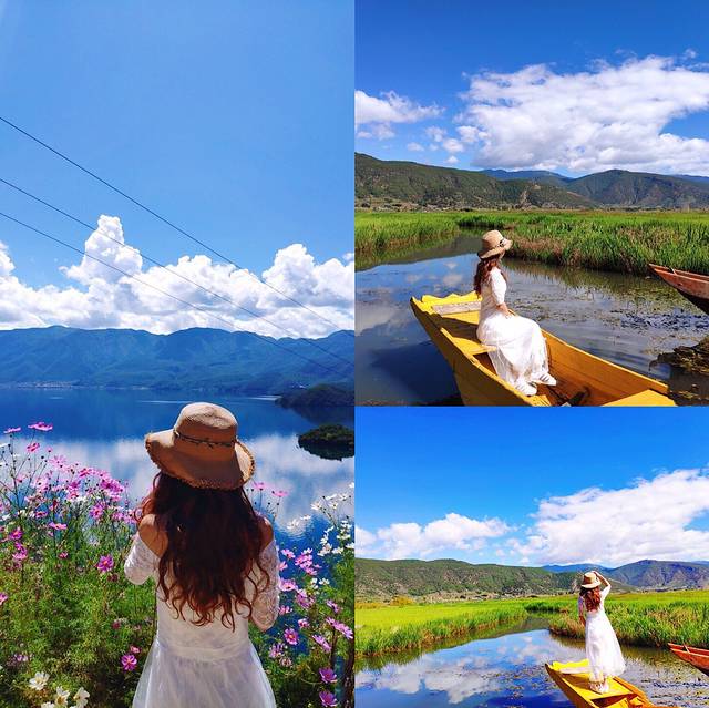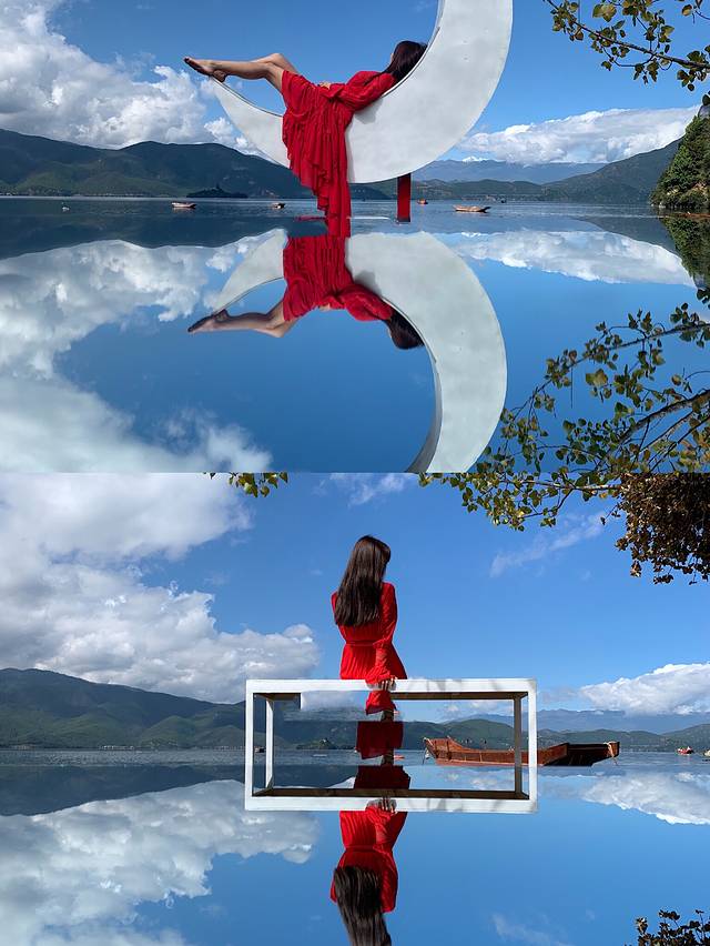 8️⃣带着长裙到里格半岛拍闺蜜照情侣照。泸沽湖最具名气、也是拍全景照最好看的地方,或是走到里格岛上,与岸边停着的色彩斑斓的猪槽船合影。