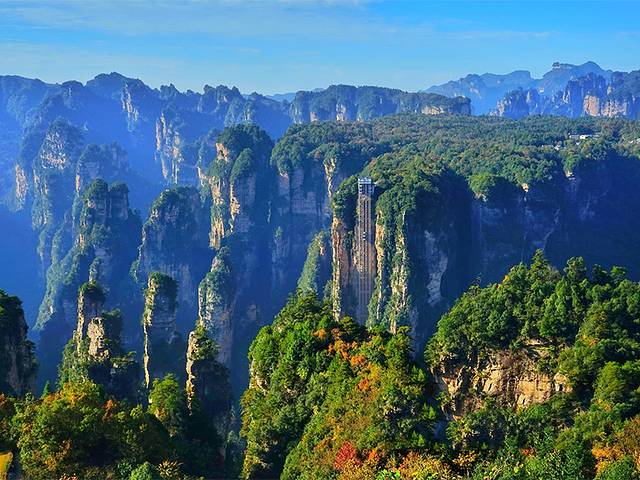 五颜六色爬满山,树木把天子山、袁家界、黄石寨、杨家界等景区的一座座石峰装扮得风情万种,峰林之巅不断变红变黄的树叶和丰收在望的田园风光