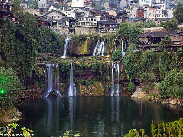 保存完好的五里青石板街,两边是板门店铺、土家吊脚楼,一路蜿蜒而行,将人带到酉水岸边的渡船码头。从码头向左望,可见芙蓉镇瀑布和其旁建在悬崖边的飞水寨