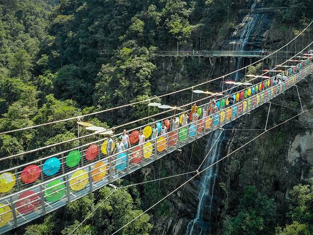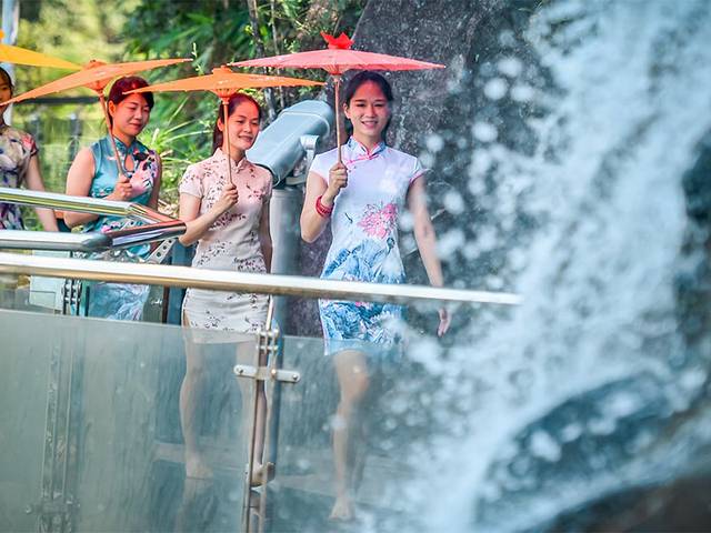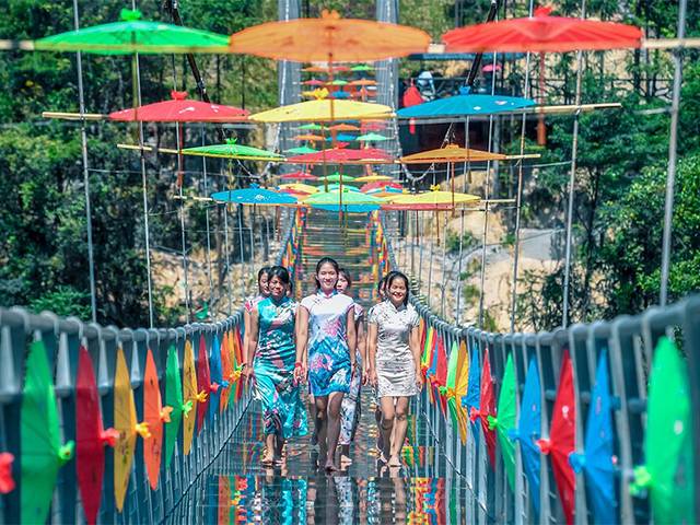 恰巧遇上在距地面140余米的高空玻璃桥与玻璃栈道上进行走秀,身着旗袍的小姐姐们举着花伞,笑靥如花,成了秋季最美的风景