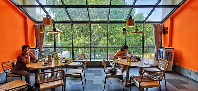 餐厅内部空间很大,目测能同时盛下十几桌旅游团了哈哈,而装饰的很高档,墨绿色和橘色对撞,配上暖色的灯光,装饰壁画,满满的海南风,也带着点西式风格。