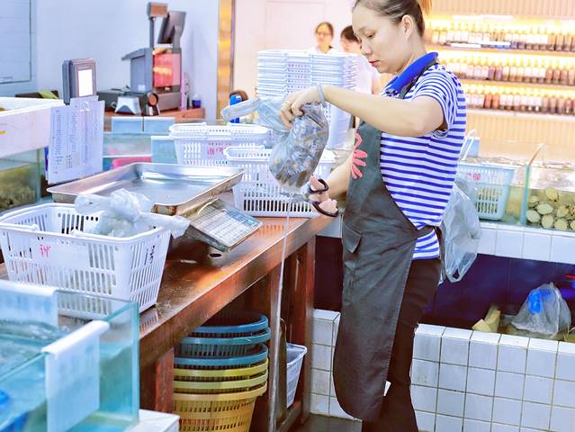 每一种海鲜都想品尝一下,尤其是那些没有试过的,可惜囊中羞涩,于是选了蟹、虾、鲍鱼、皮皮虾这些我爱吃的物种称重。这家店有一个特别的服务,就是称重前先去水,一剪刀下去,袋子里的水流了出来,剩下的可就是海鲜自身的重量了,丰俭由人,就是这么透明。