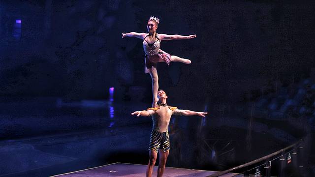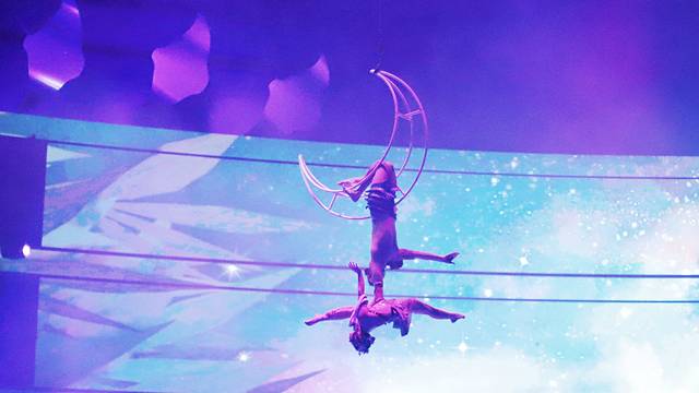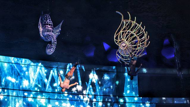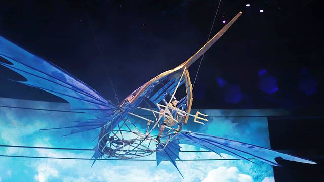 中外演员们在这个空间里,通过水上芭蕾、杂技表演、空中飞跃艺术以及跳水的形式,很多动作都非常之惊险,为我们展现了一个英雄救美的爱情故事,引起全场阵阵呐喊和鼓掌,非常之成功!