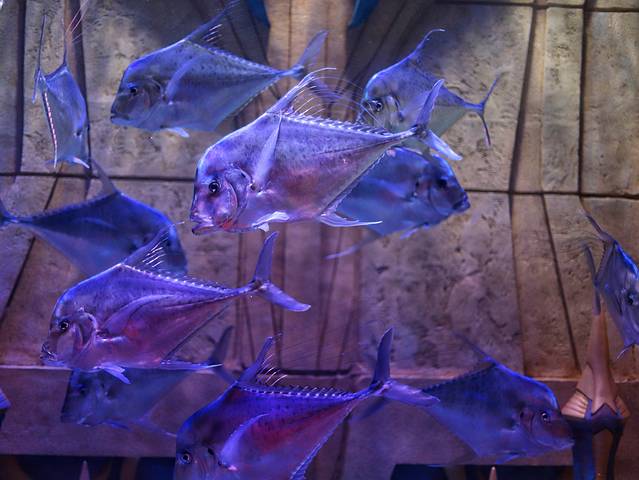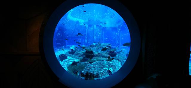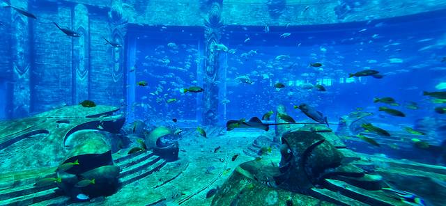 这个水族馆里有上下两层,可能规模不一定比其它水族馆大,但足够震撼。除了有上万只海洋生物生活在这里,最让我印象深刻的,当属这个长16.5米,高8.3米的巨大玻璃幕墙了,里面布置有亚特兰蒂斯的古迹,和数不清的各种海洋生物。
