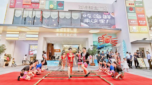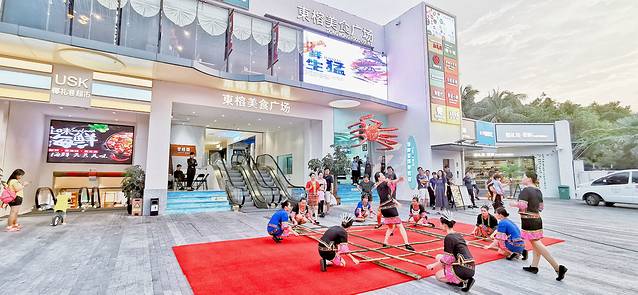 晚上抵达东榕美食广场的时候,门口已经有黎族民族表演了,在音乐的烘托下,漂亮的黎族小姐姐手舞足蹈,在竹竿之间穿梭跳跃,传递着快乐与喜悦。