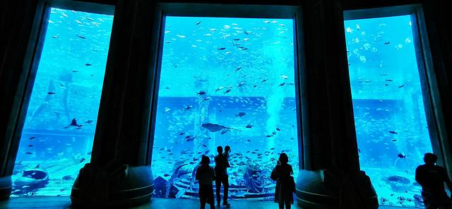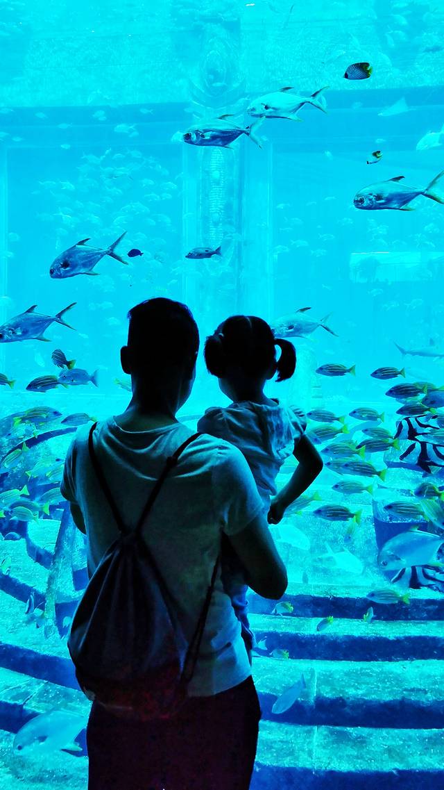 收拾好行囊,便迫不及待去亚特主楼的水族馆,水族馆地理位置非常好找,从亚特酒店大堂下一层,朝着水世界的方向,就可以看到巨大的玻璃水幕墙,感觉上千只海洋生物在这里徜徉。