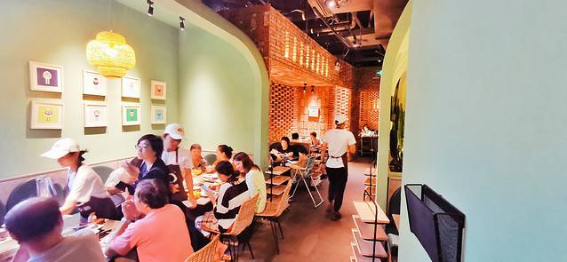 椰小鸡不愧是三亚的网红餐厅,一个火锅店,可以把店面装修的这样小清新,也是没SEI了吧。粉绿色,应该是当下的流行色了,椰小鸡的外墙和内部主色调就是粉绿色,椰小鸡的吉祥物一家子或坐在一旁,或像卫士一样守在店门前,圆咕隆咚的很可爱!椰小鸡的内饰也是以绿色为主,粉绿色的墙体,绿色的植物,掩映在橘色幽暗的灯光下,吃火锅也要如此讲究情调,给一个大大的赞!