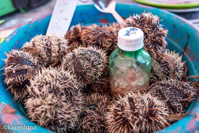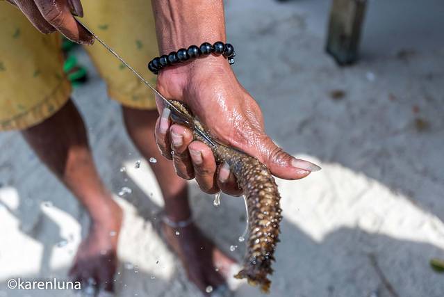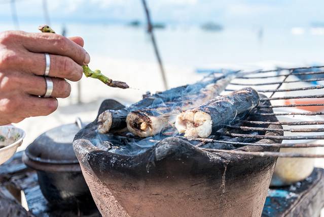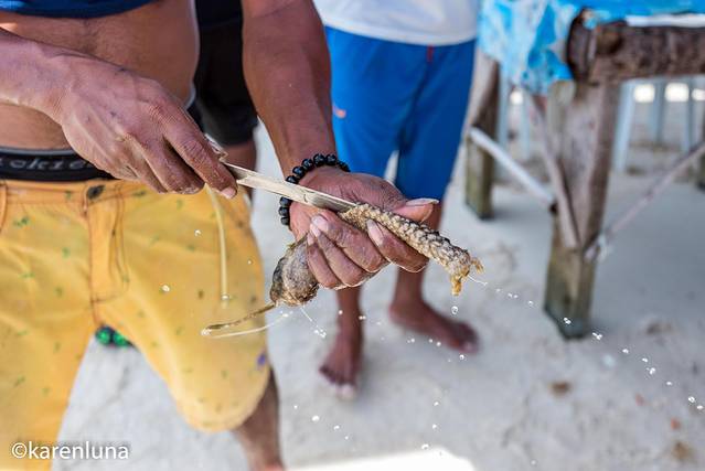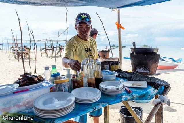 沙滩上一如既往的卖着现杀现宰现吃的海鲜。因吃生海胆而远近闻名的处女岛,如今也做起了别的美食。可能是现在中国游客们到访的越来越多,以前只有纯天然的生海胆,如今却也有了各种口味的炒味和烧烤:爆炒海参鲍鱼、烧烤鱼段石斑,感觉是把周围水下能吃的生物都研究成了盘中餐。而这里的生意也异常火爆,我们去的时候很多小摊位都已经把当天的食材卖空离开了,只剩下零星的几家,食材也已经所剩无几。