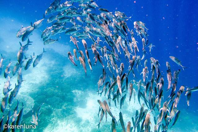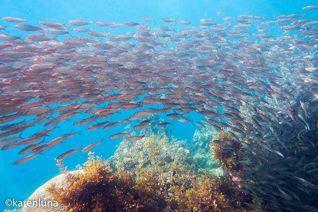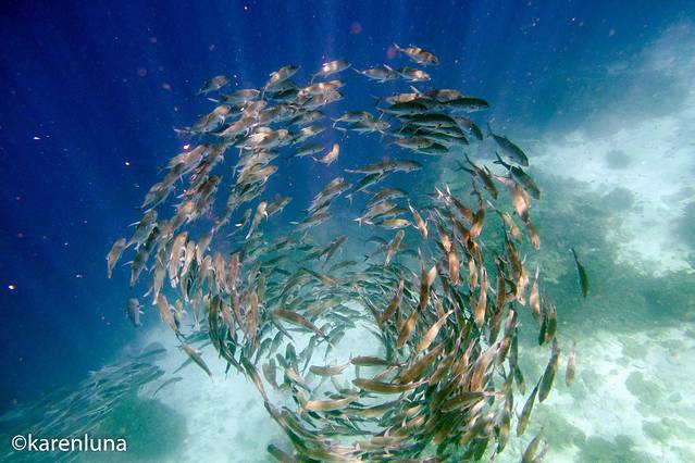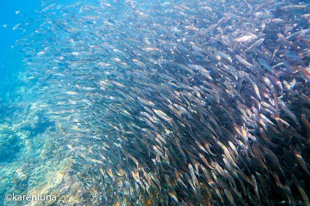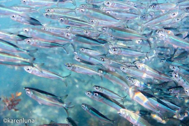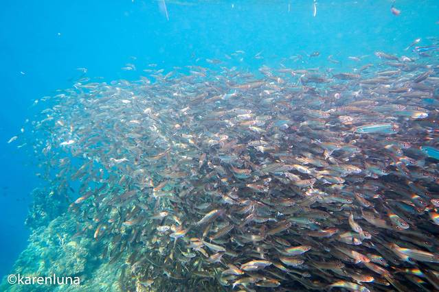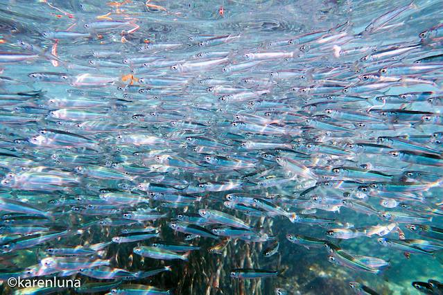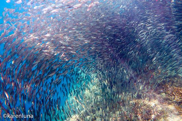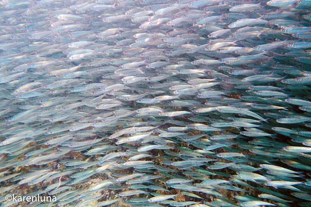 眼前一片黑压压的一群小鱼随着礁石中的暗流整齐得游荡着。开始并看不出是什么鱼,只知道数量庞大到完全看不不到另一头。直到游到鱼群中才看清,原来这环绕四周的小精灵们是沙丁鱼。