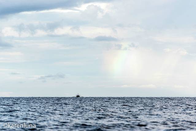 晃晃悠悠来到海豚常出现的海域,那里已经聚集了不少像我们一样的螃蟹船。还未看到海豚的一丝踪迹,倒先是被一片彩虹Say早安。据说看到彩虹就能有好运气,真希望早上能与成片的海豚有个亲密接触。